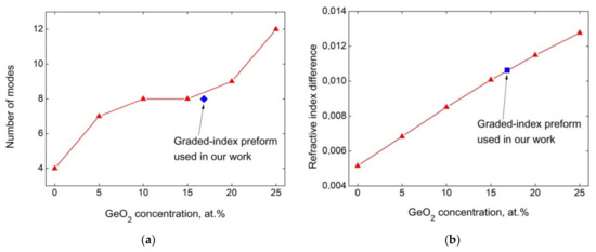 Calculated number of modes (a) and refractive index difference between the first and second excited modes (b) depending on the GeO2 concentration of the six-core-MOF based on the core elements with graded-index profile.