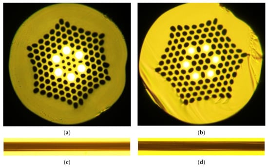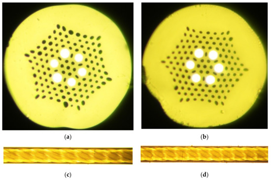 Strongly twisted six-core-MOFs with graded-index core supporting elements: (a) cross-section view of the fabricated MOF with twisting 400 rpm; (b) cross-section view of the fabricated MOF with twisting 500 rpm; (c) longitudinal view of the fabricated MOF with twisting 400 rpm; (d) longitudinal view of the fabricated MOF with twisting 500 rpm.