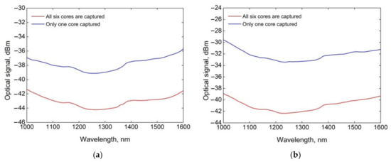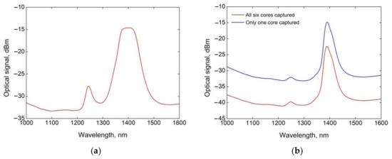 Transmission spectra are presented in Figure 10. We researched the wavelength band λ = 1000…1600 nm by using a halogen lamp as a light source, a programmable monochromator, a germanium photodiode, an optical amplifier, and an optical power meter. Here, the lengths of the tested MOFs with induced twistings of 50 and 100 rpm were 5 m. Strong improvement in optical signal power level during all six-core excitation (MOF end face radially overfilled launching conditions) should be noticed (Figure 10b—red line) in comparison to only one core excitation (Figure 10b—blue line). This fact may be considered as confirmation of weak mode coupling, propagating in neighboring cores, that may be improved by induced longitudinal chirality (e.g., twisting). Additionally, typical “water peaks”—strong increasing silica MOF attenuation at resonance wavelengths 1240 and 1380 nm due to OH– ion absorption—can be noticed.