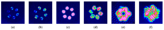 The comparison of all six detected laser beam profile patterns shown in Figure 15 demonstrates the efficiency of the OFL conditions in comparison with a connection via large core MMFs. Therefore, the next test series was focused on studies of laser connections to the tested MOF via SMF under OFL. Here the BLD source was connected to a 100 rpm twisted graded-index GeO2-doped six-core-MOF via pig-tail with SMF. The end faces of both optical fibers were prepared by a precise commercially available fiber optic cleaver. SMF and MOF center aligning with a desired 150…200 µm air gap for OFL conditions were set by the field fusion splicer. During the first three tests, we measured the beam profile under various BLD source output powers (Figure 16a–c—according to specification, maximal is 100 mW) to detect the optimal operation mode that provides a strong enough intensity of launched optical emission to receive a high-quality and detailed laser beam profile pattern. Then, we fixed the output power (at the medium order) and made some variations in the distance between the tested MOF receiving end and the IR camera objective by using a three-axis micropositioner (Figure 16d–f). Here, a 0 µm distance corresponded to a maximal contrast of the detected MOF end-face image (Figure 16d), while further increases in the distance modified the laser beam pattern and added some interferometric/optical vortex-like effects. During the next stage of research, we tested the same setup (BLD, OFL conditions via SMF, 100 rpm twisted graded-index GeO2-doped six-core-MOF) and measured laser beam profile pattern dynamics by varying the distance between the receiving end face of the tested MOF and the IR-camera objective over the range of 0…100 µm, which is presented in Figure 17. Here, under a distance of more than 30 µm, the pattern is modified by some interferometric effects.