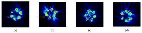 The last (additional) test series included measurements performed for a low-wavelength (λ = 980 nm) laser beam profile after propagation over a 5 m long six-core-MOF with both a graded- and step-index. Here, we utilized special SMF with a shifted cut-off condition, providing single-mode operation at a wavelength of λ = 980 nm. The special SMF was connected to SL and aligned to the tested MOF by using the above-described focusing system (over free space, also with an air gap to provide OFL conditions). Both the MOF and special SMF end faces were cleaved by a cleaving tool with quality control by a microscope. Measured beam profiles at the receiving end of both the graded- and step-index six-core-MOFs with twistings of 50 and 100 rpm are shown in Figure 18. Here, the tested MOF excitation by a low-wavelength laser source led to an improved propagating mode number. This made the detected beam profile more similar to the MMF speckle pattern (especially for the step-index six-core-MOF—Figure 18c), while under an improvement in the twisting order, the pattern becomes somewhat more “clear” (Figure 18b,d).