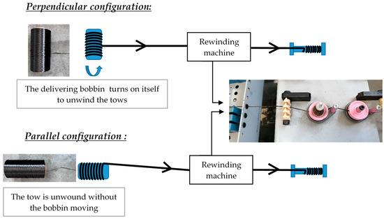 The degradation of carbon tows that occurs during the rewinding step was tested on a 2PVLU\220 Ratera® winding machine [28]. Two bobbins can be rewound simultaneously on this specific device. A potentiometer allows the user to control the speed at which the bobbin is rewound by increasing or decreasing the speed of rotation of the bobbin as well as the speed of displacement in putting the carbon tow on the bobbin. C. Cherif [29] showed that a low production speed may be more appropriate for brittle and fragile carbon-based products in order to minimize friction [30]. In this study, the influence of winding machine parameters on the degradation of carbon tows was investigated. Three parameters were considered: the speed used during rewinding and orientation (or placement) of the bobbin and angle (defining the position of the delivering bobbin) at which the tow is introduced into winding machine. For the orientation of the bobbin in relation to the winding machine, two configurations were considered. The concept of a winding machine is represented in Figure 1, with the two configurations of the bobbin orientation. When this bobbin is parallel to the axis of the winding machine, only the carbon tow is in a position to be unwound (configuration denoted as Parallel). If this bobbin is placed perpendicular to the axis of the winding machine, it then turns on itself to unwind the roving fed to the winding machine (configuration denoted as Perpendicular).