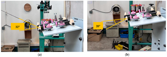 For the position of the delivering bobbin, two different angles were chosen. When the delivering bobbin is placed on the highest position of the creel, carbon tows enter into the winding machine at an angle of 32°, as shown in Figure 2a. In the lowest position of the creel, the carbon tows enter the winding machine at an angle of 20°, as shown in Figure 2b. The 32° angle is the highest value possible on this winding device, and will apply the most friction to the tows. The second position, associated with a lower angle (20°), is considered a more general rewinding configuration [23]. This position parameter was studied to analyze if the angle value applied during entry to the rewinding machine has a significant influence or not on the degradation of the tows.