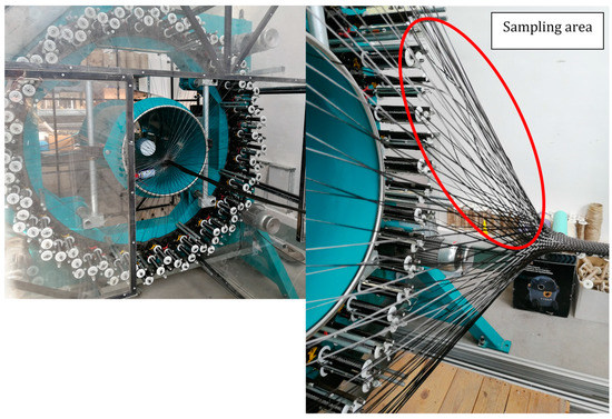 Once the carbon tows were rewound, the bobbins could be placed on the braiding machine. A HERZOG radial braiding machine with a capacity of 144 spools (96 and 48 for bias and axial tows, respectively) was used in the GEMTEX laboratory (Figure 3). It has been described in previous works [31,32,33,34]. As explained in the Introduction, tension plays a key role in the degradation of carbon tows and has an influence on braid parameters.