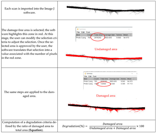 In this study, the samples were analyzed via image analysis and with tensile tests. Each tow sample was scanned at a resolution of 600 ppx. The images were then imported into the image processing software ImageJ [38]. The analysis was based on the damaged and non-damaged areas of the tow where no filament was broken or misaligned. The areas considered were highlighted in red by the software. Adjustments could be made manually to be as accurate as possible. Once the areas were selected, the software translated the selected surface into a value corresponding to the number of pixels located in the zone. The ratio of the area of damaged surface to the total surface considered allowed us to define a percentage of degradation of the tow occurring during the rewinding and braiding processes. The steps of this approach are described in Figure 4.