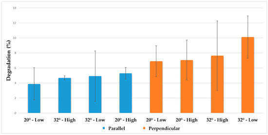 Figure 5 shows that when the delivering bobbin was placed perpendicular to the axis of the winding machine (configuration in orange on the graph), a greater degradation was seen than when it was placed parallel to this axis (configuration in blue on the graph), regardless of the configurations of the speed or position parameters. In the parallel configuration, the delivering bobbin was aligned with the production axis. Therefore, the tows were free to unwind from the bobbin with no restriction. However, in the perpendicular configuration, the delivering bobbin had to roll in order to free the tows. Because the tows need to be transferred from the delivering bobbin to the receiving one, they were the ones driving the movement of the delivering bobbin. Therefore, the tows must be stretched and under tension during the rewinding process. The heavier the delivering bobbin is, the more tension is applied to the tows, increasing the rubbing of the tows against the guiding parts of the machine. This added friction results in a higher degradation percentage, in accordance with the observations made by Czichos [15] and the findings of several studies [18,19,20,21]. The highest position of the delivering bobbin (with an angle of 32°) seemed to increase the degradation of carbon tows, especially when this parameter was associated with a perpendicular orientation. Here, again, a higher angle value can be translated to higher stress for the carbon tows, and more friction where the angle is formed. The influence of rewinding speed (configurations: Low or High) seems to be low regardless of the other parameters.