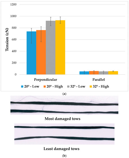 Figure 6a shows that when the delivering bobbin was placed perpendicular to the axis of the winding machine, the weight of the bobbin provided additional tension for the roving, which was significant compared to the tension values measured when the delivering bobbin was placed parallel to this axis. As shown previously for the degradation criteria, an angle of 32°, associated with the highest position of the delivering bobbin, increases tension on carbon tows. Figure 6b shows carbon tows with two extreme values of the studied parameters after the rewinding step. For samples with the configuration “32°-Low-Perpendicular”, which had a higher value of the damage criterion, as shown in Figure 5, and higher tension applied on carbon tows, as shown in Figure 6a, the damage was clearly visible compared to samples with the configuration “20°-Low-Parallel”. These results show the link between the tension applied on carbon tows and the degradation occurring during this rewinding step.