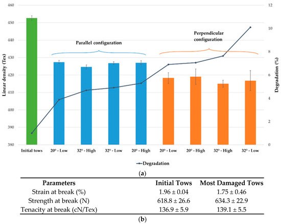 At the scale of tows, the level of damage was quantified with the measurement of the linear density and the tenacity at break of samples after rewinding. Figure 7a shows the comparison of the linear density of samples relative to the initial value before rewinding, as given in Table 1. The superposition on this curve (in black in Figure 7a) of the evolution of the degradation criterion shows a clear trend in the evolution of the linear density: the more the tows were damaged, the more the linear density decreased. For the most damaged samples, we observed a relative decrease of 6.3% in the yarn count. As shown in Figure 6b, the degradation of carbon tows took the form of filament breaks as well as surface fibrils due to friction, which indicates material loss and a decrease in the linear density of the tows. Figure 7b compares the tensile characteristics of the most damaged sample with that of the initial tows. We can deduce that the level of damage does not involve, at the tow scale, a significant decrease in mechanical properties.