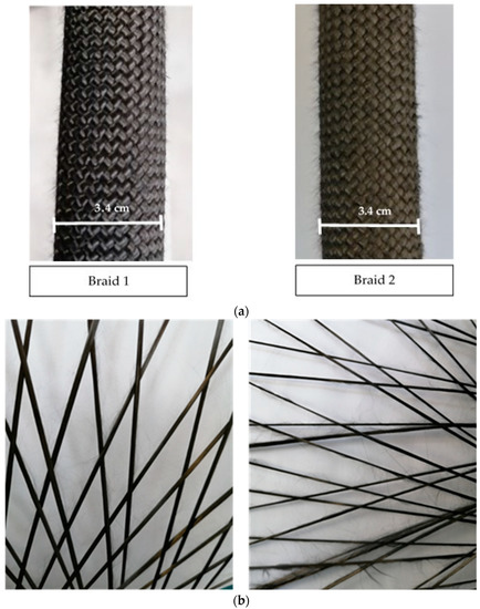 Two-dimensional biaxial braids can be obtained by interweaving yarn around a mandrel using a maypole or radial braiding machines with different braid patterns; additional axial fibers can be introduced to produce triaxial-braided structures [3,4,5,6]. Considering the description of the braiding process, numerous studies have analytically linked the process parameters to the braid characteristics, such as the braiding angle or the cover factor [7,8,9]. The influence of these characteristics, the type of braids (biaxial or triaxial), and braid patterns on the mechanical properties of braided composites has been the subject of many works [6,9,10,11,12].