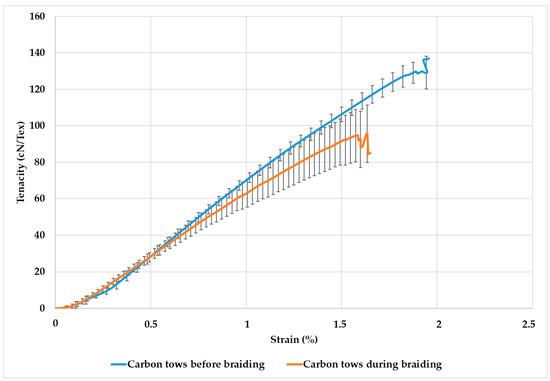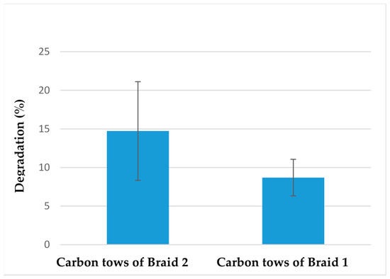 These visual observations were confirmed by the degradation of the carbon tows extracted from the sampling area (Figure 3), and quantified thanks to the criteria defined in the image analysis method detailed in Figure 4. The degradation criteria for carbon tows used in the production of both braids are given in Figure 9. These values showed 15% degradation when the stiffest springs were used (carbon tows of Braid 2), compared to 8% degradation with the less stiff springs (carbon tows of Braid 1). Results in Figure 9 show the same tendency observed in the rewinding step: a higher tension results in a higher degradation of the carbon tows. The values of the degradation criteria were quantitatively higher than those measured during the rewinding process (Figure 5). The influence of this degradation on the mechanical behavior of carbon tows was studied via the comparison of the tensile behavior of carbon tows extracted from the sampling area during the production of Braid 2 with that of the initial tows, as shown in Figure 10. Compared to the initial properties of the carbon tows before braiding, the degradation of carbon tows during the braiding stage affected their tensile properties. From these curves, parameters associated with these mechanical behaviors are compared in Table 5. This comparison shows a loss of properties equal to 17%, 30% and 27% for the strain at break, the load at break and the tenacity, respectively. These values are in accordance with the loss reported in several studies on the degradation of tows used in the winding process [19,20,21]. Compared to the influence of degradation on the mechanical behavior during the rewinding step (Figure 7b), these results show the significant influence of the level of damage during the braiding step.