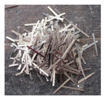 The cement composite samples were prepared using ordinary Portland cement (OPC) as a binder while Class F fly ash was used as a binder for geopolymer composite. The chemical compositions of both the OPC and fly ash are given in Table 1. For the fine aggregates, natural silica sand was used in saturated and surface dried conditions before preparing the mixes. Fineness modulus of fine aggregate (natural sand) was 1.8 and the maximum aggregate size of sand was 1.18 mm. The amorphous metallic fibres (AMF), as well as the alkali activators used in this research study, are similar to the ones used by the authors’ other study [35]. The length, width, and thickness of the AMF were 15 mm, 1 mm, and 24 µm, respectively. The tensile strength and elastic modulus of the AMF were 1800 MPa and 140 GPa, respectively [18]. A photo of AMF is shown in Figure 1. The alkali activator consisted of an 8-M sodium hydroxide (NaOH) solution blended with D-grade sodium silicate (Na2SO3) solution. The ratio of sodium silicate to sodium hydroxide was constant at 2.5 in all composites. The ratio of sodium silicate to sodium hydroxide solution and the molarity of sodium hydroxide used in this study are based on the authors’ previous study [18], as these are the optimum alkali content for geopolymer concrete.