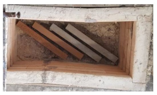 After 28 days of curing and drying of the composites, all specimens were heated at designated elevated temperatures in the electric kiln with a maximum temperature rating of 1200 °C. The samples were heated to four different temperature ranges of 200 °C, 400 °C, 600 °C, and 800 °C. The heating rate for all the samples was kept at 5 °C per minute, as recommended by RILEM [43], until the desired temperature was attained. For measuring the ambient temperature in the kiln and temperature on the surface of the samples, two “type K” thermocouples were used which were connected to the data logger. After attaining the desired temperature, the samples were kept in the kiln for an additional 120 min to ensure that the core temperature also attained the desired temperature. After heating, the samples were left inside the kiln, as shown in Figure 2, overnight to cool in ambient temperature inside the laboratory and then weighed to determine any weight loss.