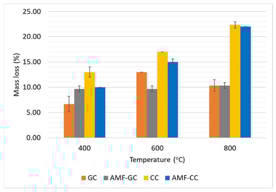 When exposed to elevated temperatures, both the cement and geopolymer composites exhibited mass loss. The mass of the cube samples before and after heating were measured, and the average values are presented in Figure 3. From this table, it can be seen that an increase in the exposure temperature leads to greater mass loss, and the maximum mass loss was observed in samples heated to 800 °C. Overall, the mass loss in geopolymer composites was lower than that of the cement composites, especially at 800 °C where the average mass loss in geopolymer composites was 11% versus 23% in cement composites. The mass loss of 11% in the geopolymer composites is similar to the results of Hosan et al. [41], who obtained similar values for un-reinforced geopolymer composites.