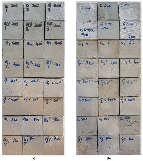 Also, the color of the specimens changed to slightly reddish at elevated temperatures. For the cement composites, this color change started appearing at 400 °C while for the geopolymer composites, this color shift started occurring at 600 °C. The cracking behavior observed is similar to the behavior observed by Lu and Anson [45] and Shaikh and Hosan [46]. For the cement composites, Lu and Anson [45] found that the unreinforced cement composites started cracking at 400 °C while the reinforced cement composites started cracking at 600 °C and the cracking became severe with the further increase to 800 °C. Shaikh and Hosan [46] also observed that the cracking in steel fibre reinforced cement composites (SFRC) started occurring at 600 °C and became severe at 800 °C while the steel fibre reinforced geopolymer composite showed no sign of cracking up until 800 °C.