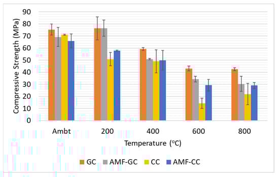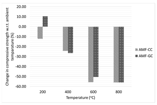 - The compressive strength of AMF reinforced geopolymer composites was higher than that of cement composites at all temperature levels. The residual compressive strength of reinforced cement composites at 200 °C, 400 °C, 600 °C, and 800 °C was 88%, 76%, 44%, and 45% to that of the strength at ambient temperature. The corresponding residual strength of reinforced geopolymer composites was 110%, 74%, 49%, 45%.