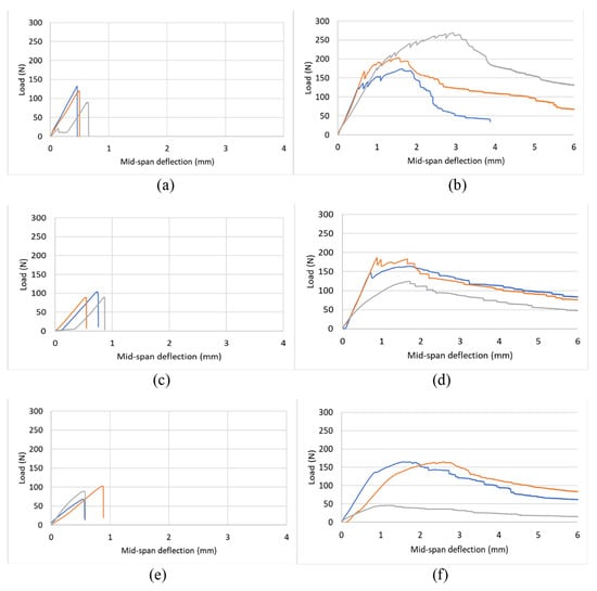 Flexural load vs. midspan deflection (a) UCC at ambient temperature (28 °C) (b) RCC at ambient temperature (28 °C) (c) UCC at 200 °C (d) RCC at 200 °C (e) UCC at 400 °C (f) RCC at 400 °C.