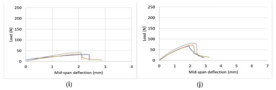 Flexural load vs. midspan deflection (a) UGC at ambient temperature (28 °C) (b) RGC at ambient temperature (28 °C) (c) UGC at 200 °C (d) RGC at 200 °C (e) UGC at 400 °C (f) RGC at 400 °C (g) UGC at 600 °C (h) RGC at 600 °C (i) UGC at 800 °C (j) RGC at 800 °C.