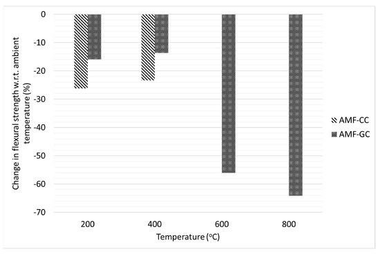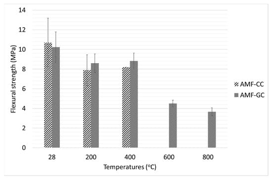 - Similar to the compressive strength, the flexural strength of the composites also reduced with increasing temperature and the flexural strength of the AMF reinforced geopolymer composites was higher than that of cement composites at all elevated temperatures. The residual flexural strengths of AMF reinforced cement composites at 200 °C, 400 °C, 600 °C were 76%, 78% respectively, while the residual flexural strengths of AMF reinforced geopolymer composites at 200 °C, 400 °C, 600 °C, and 800 °C were 80%, 81%, 43%, and 45% to that of the strength at ambient temperature.