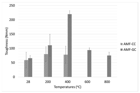 The toughness of the reinforced cement and geopolymer composites was also calculated and the average results are presented in Figure 11. Toughness is an important parameter to assess the energy absorption capacity of a member and is calculated by the area under the load-deflection curve up to a given deflection. In Figure 11 the toughness presented has been calculated using the area under the load-deflection curves until the point of peak load and the values given are the average of 3 specimens. Overall, the toughness of AMF reinforced geopolymer composites was higher than that of the cement composites and these toughness values increased up to 400 °C. The toughness increased slightly for cement composites whereas there was a sudden jump in the toughness of reinforced geopolymer composites at 400 °C as the toughness increased by 230% as compared to the toughness at ambient temperature. After 400 °C, there was a sharp decrease in the toughness of reinforced geopolymer composite, however, the toughness at 800 °C was still higher in reinforced geopolymer composite than the toughness at ambient temperature. The toughness results are also consistent with previous research studied on fracture toughness and fracture energy [60,61], which found that the fracture energy of the composites increases gradually as the temperature increases from 25 °C to 400 °C. As compared to the sharp crack development at room temperature, the crack development and propagation at higher temperatures are quite complex and this complexity is exacerbated by the inclusion of fibres [49].