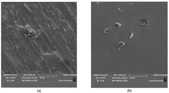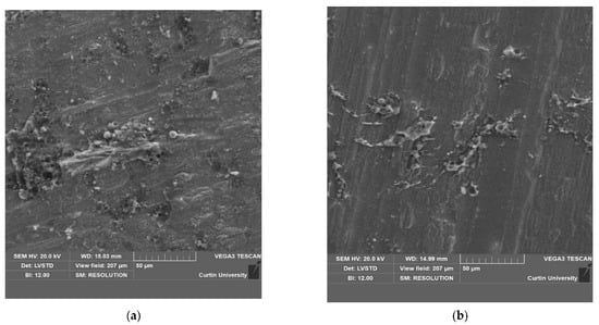 The scanning electron microscope (SEM) images of reinforced cement composites and geopolymer composites are presented in Figure 12 and Figure 13, respectively. For the AMF fibres at ambient temperatures in the cement composite (Figure 12a) and in the geopolymer composite (Figure 13a), it can be seen that the surface of the fibre is relatively rough and the matrix is also present on the surface of the fibre. For the cement composite (this matrix is smaller in amount than the geopolymer composite which explains the reason for the higher compressive and flexural strengths of geopolymer composites than the cement composites. As the temperature increases, the amount of matrix on the fibres decreases. For the cement composites at 800 °C (Figure 12b), it can be seen that the amount of matrix on the fibres is negligible which resulted in significant cracking in lower residual flexural strength of reinforced composites. However, for the reinforced geopolymer composite at 800 °C, the surface of the fibre is relatively rough than that of the cement composite and a higher amount of geopolymer matrix is present on the surface of the fibre. This rough surface of the fibre and higher amount of matrix explains the reason for negligible cracking in the geopolymer composite specimens and higher residual compressive and flexural strength of these composites.