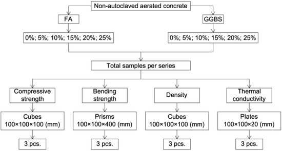 There are studies of cellular concrete modified with various additives, such as fly ash (FA) [5,19], ground granulated blast-furnace slag (GGBS) [5,8], rice husk ash [6], glass sand [11], quarry dust and lime ash [12], and microsilica [8,20]. These studies assessed the physical and mechanical properties of concrete, most of which are compressive strength (CS), bending strength (BS), water absorption and thermal conductivity (TC). Additionally, many works paid special attention to the analysis of the pore structure of cellular concrete [3,11], including a modified one. Improvements in the structure, strength and physical characteristics of the composites were noted.