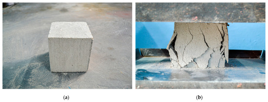 Sample of aerated concrete modified with GGBS and reinforced with SF: (a) before the compression test; and (b) after the compression test.