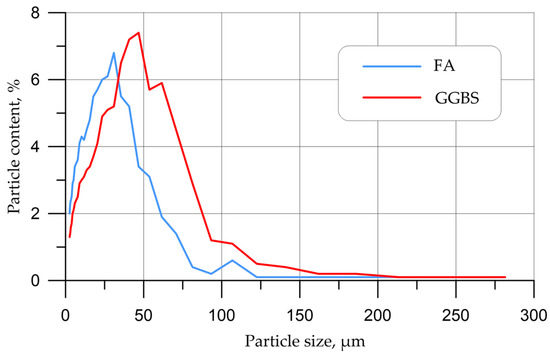 Figure 6 shows that after additional grinding, the FA particle distribution curve is shifted to the left and down compared to the GGBS particle distribution curve. The largest part of the FA particles, 88.3%, is in the range from 2 μm to 41 μm. Additionally, the largest part of the GGBS particles, 88.7%, is in the range from 2 μm to 62 μm.