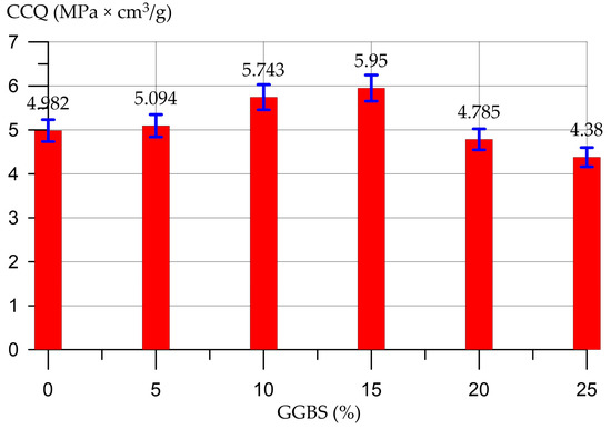 As in the case of FA, the best values of the physical and mechanical characteristics of non-autoclaved aerated concrete are observed when replacing part of the cement with 15% GGBS. The trend of density, CS, BS and TC is to increase the strength characteristics and decrease the density and TC when replacing GGBS cement in an amount of 5–15% and decrease the strength and increase the density and TC with GGBS content in an amount of 15–25%. CS increased by 17.3%, BS by 16.7%, density decreased by 1.8% and TC decreased by 9.5%. These results are in good agreement with the study [66] in terms of changing the characteristics of the modified aerated concrete in relation to the control composition. Figure 10 shows the calculated CCQ values for non-autoclaved aerated concrete modified with GGBS.