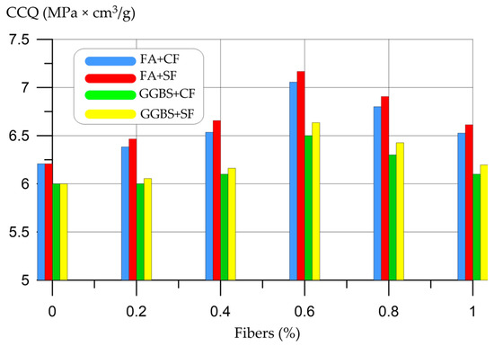Samples of non-autoclaved aerated concrete modified with 15% GGBS have the highest CCQ value, 20% more than that of control samples. A gradual slight increase in CCQ (up to 2%) with an increase in the FA content from 0% to 5% and a sharper jump in CCQ from 5% to 15% GGBS (up to 18%) can be noted, which is associated with a decrease in density and an increase in CS of aerated concrete samples. At dosages of GGBS 20% and 25%, its rapid decrease (up to 27%) is observed, due to an increase in density and a decrease in CS of aerated concrete.