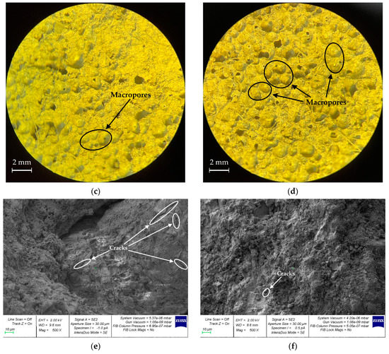 The structure of the modified aerated concrete reinforced with fibers was studied using an MBS-10 optical microscope (Izmeritelnaya Tekhnika, Moscow, Russia) and a ZEISS CrossBeam 340 electron microscope (Carl Zeiss Microscopy GMBH (Factory), Jena, Germany) with a magnification of 500 times.
