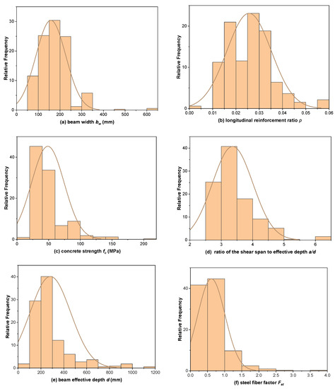 To investigate the impact of the input variables on the mechanical behavior and shear failure mode, the researchers conducted experimental investigations on the shear behavior of SFRCB. Study [49] compiled a comprehensive database of 488 trials on SFRC beams without stirrups. After sifting through the original collection of 488 experiments, a subset of 332 experimental tests were selected for this study after filtering out beams with a shear-span to effective depth ratio (a/d) less than 2.5, which are considered non-slender beams, and beams with a shear-flexure mode of failure. The database that resulted from the 332 experiments was used to develop models. The evaluation database incorporates slender beams with rectangular and flanges cross-sections. Figure 1 (adapted from [26]) presents the distribution of the key parameters within the referred database.