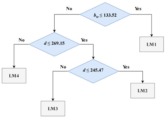 Figure 2 showcases the developed model tree, formed by employing the M5P approach. Additionally, Table 2 supplies the coefficients pertaining to Equation (4), as forecasted by the M5P algorithm.