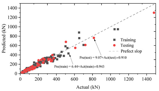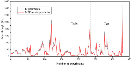 In order to assess the precision and efficiency of the M5P model from an alternative viewpoint, Figure 4 displays the predicted and experimental values of the shear strength in both the training and testing datasets. The results in Figure 4 confirm the previous observations about the accuracy of the M5P model.