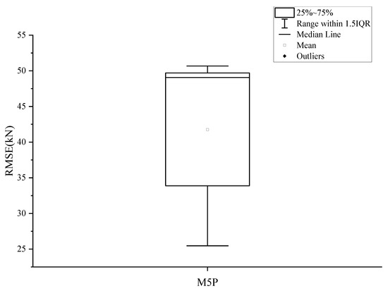 The RMSE performance of the model on all the data points is 38 (kN), while the average performance of the 5-fold cross-validation is 41 (kN). This suggests that the model’s performance on unseen data is relatively close to its performance on the training data, indicating that the model is not prone to overfitting. The smaller difference between the two RMSE values suggests that the model is more likely to generalize well to new data. A box plot displaying the distribution of the model performance across the five folds of the data can typically be seen in Figure 5.