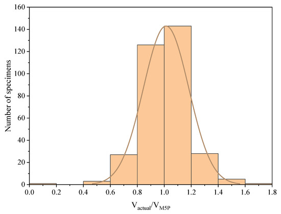 The M5P model equations LM1, LM2, LM3, and LM4 do not consistently overestimate all data points, but rather produce both overestimated and underestimated predictions. For this reason, introducing a reduction factor can still further improve the reliability of the predictions. This can be especially important in scenarios where reliable predictions are necessary to satisfy the design conservatism and can help ensure that the model is an effective tool for generating insights from data. As shown in Figure 9a–d, the Vexp/VM5P ratios exhibit a minor level of scatter and do not follow a normal distribution (Lognormal). Therefore, the reduction factor needs to be applied to account for the statistical uncertainties associated with estimating the characteristic value of the Vexp/VM5P ratio. Equation (6) provides a means of calculating the reduction factor, as recommended by EN 1992 [7,70]. By using this approach, engineers can be confident that their designs are based on sound engineering principles and are safe and reliable in a range of different scenarios.