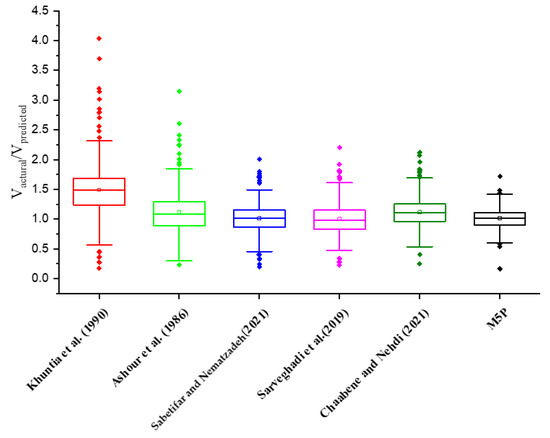 In order to evaluate quantitatively the safety of the proposed model and contrast it with earlier models, demerit points are assigned to each prediction made by these models, incorporating a total of 332 data points based on the criteria outlined in Table 6. This approach enables a comprehensive comparison of the safety performance between the models. The cumulative demerit values for each model are calculated by summing the products of specimen counts and corresponding penalties within each interval as shown in Table 7. A lower total sum value indicates a higher safety level for the model under study. For instance, the model from Khuntia et al. [54] has four instances, where Vactual/Vpredicted < 0.5. Referring to Table 6, each of these 4 points carries a penalty of 10. Thus, the total penalty is calculated as 4 × 10 = 40. This method enables an effective evaluation and ranking of various models’ safety performance, guiding the selection of the safest and most reliable model for practical applications. It is crucial to highlight that the M5P algorithm demonstrates the lowest demerit penalty among the various prediction models, indicating its superior safety performance. Based on the Collins scale, approximately 70% of the predictions made by the M5P algorithm fall within the safe and acceptable range, further emphasizing its reliability and effectiveness