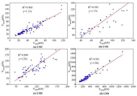 where is a reliability index taken as 3.8, is a sensitivity factor taken as 0.8, a is the slope of the relationship between Vexp and VM5P, and is the standard deviation of Vexp/a × VM5P. Those values and relationships are recommended by EN 1992 [7]. As depicted in Figure 10a–d, the slope values (a) of 1.11, 1.17, 1.23, and 1.04 are assigned for equations LM1, LM2, LM3, and LM4, respectively. By substituting these values in Equation (7), engineers can estimate the reduction factor for the shear strength of SFRC slender beams from equations LM1, LM2, LM3, and LM4, as 0.69, 0.69, 0.85, and 0.65, respectively.