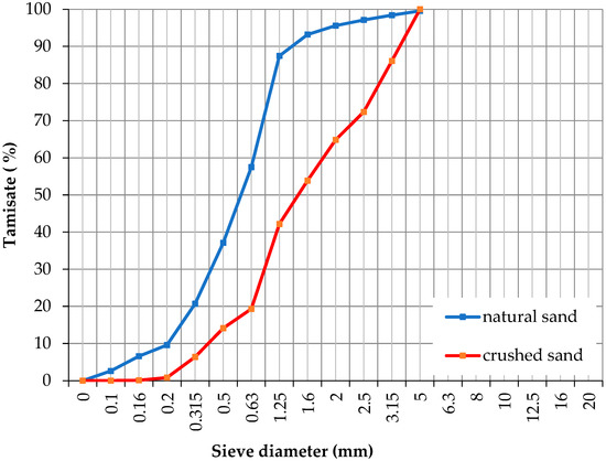 Two types of sand were used in this study, a fine siliceous sand 0/2 and a crushed limestone sand 1.25/5. Table 5 shows the physical properties of the sands used, and Figure 1 shows the granulometric curve.