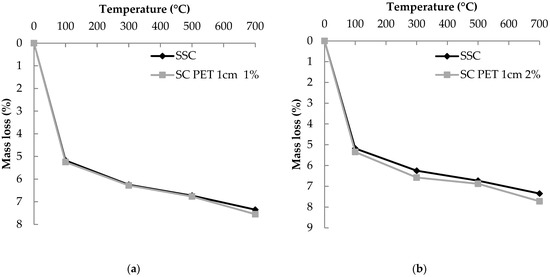 Loss of mass of sand concrete in function of the heating temperature: (a) standard sand concrete and sand concrete with 1 cm 1% of PET, (b) standard sand concrete and sand concrete with 1 cm 2% of PET, (c) standard sand concrete and sand concrete with 2 cm 1% of PET, and (d) standard sand concrete and sand concrete with 2 cm 2% of PET.