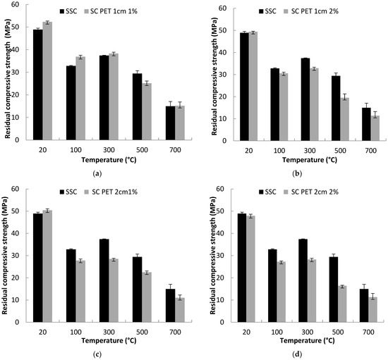 Residual compressive strength of sand concrete in function of the heating temperature: (a) standard sand concrete and sand concrete with 1 cm 1% of PET, (b) standard sand concrete and sand concrete with 1 cm 2% of PET, (c) standard sand concrete and sand concrete with 2 cm 1% of PET, and (d) standard sand concrete and sand concrete with 2 cm 2% of PET.