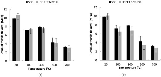 According to Figure 6, the values of the flexural tensile strength of the concretes tested decrease continuously with the rise in temperature. The general appearance of the curve is not modified by the addition of PET fibers, and it is similar to concretes without fibers.