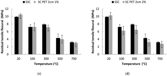 Residual tensile flexural strength of sand concrete in function of fiber content and heating temperature: (a) standard sand concrete and sand concrete with 1 cm 1% of PET, (b) standard sand concrete and sand concrete with 1 cm 2% of PET, (c) standard sand concrete and sand concrete with 2 cm 1% of PET, and (d) standard sand concrete and sand concrete with 2 cm 2% of PET.