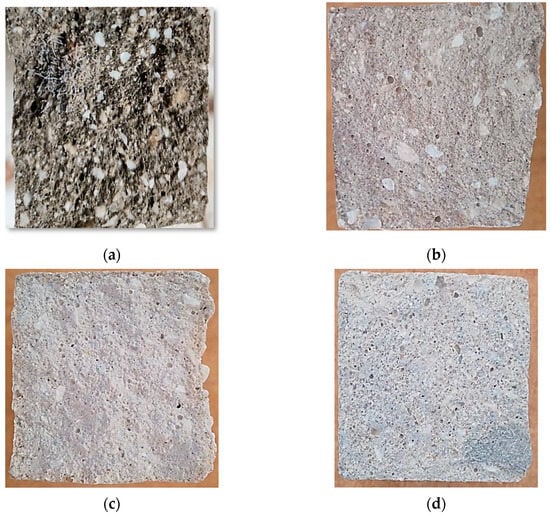 Optical picture of sand concrete subjected to different temperatures: (a) 100 °C, (b) 300 °C, (c) 500 °C and (d) 700 °C.