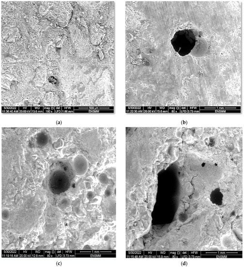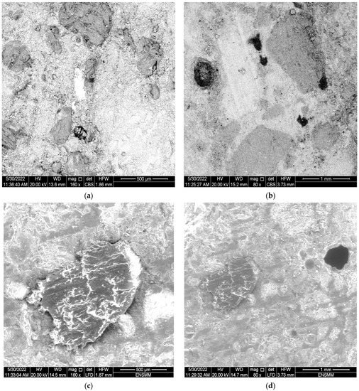 Figure 8 shows the matrix–aggregate interface areas, compactness and micro-porosity of the control sand concrete. The figure shows that all sand concretes have a dense microstructure with a good cementitious–aggregate matrix bond. On the other hand, after heating to 700 °C, the concrete becomes more porous; this is due to the departure of a large part of the water chemically linked to a high heating temperature [14,15].