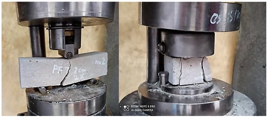 The physical–mechanical characteristics of the sand concrete are obtained using measurements of the tensile strength via flexion and compression on specimens that are 4 × 4 × 16 cm3, in accordance with standard NF EN 12390-1 [31]. The preparation of the specimens is carried out according to standard NF EN 12390-2 [32], and the mixing is carried out using a concrete mixer with a capacity of 25 L and a total mixing time of around 5 min.