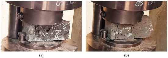 Figure 10 shows the behavior of the standard and PET fiber sand concretes before exposure to high temperatures. It shows the three-point bending test with a 45° mode of failure, which is a common mode in cementitious composites. According to EN 12390-3 [46], this mode is conditioned by the frictional forces that develop between the press plates and the faces of the specimen; these frictional forces are directed towards the interior of the specimen and slow down the evolution of the transverse deformations of the concrete [2,8].