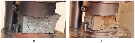The mode of failure of sand concrete exposed to high temperatures: (a) 100 °C, (b) 300 °C, (c) 500 °C and (d) 700 °C.