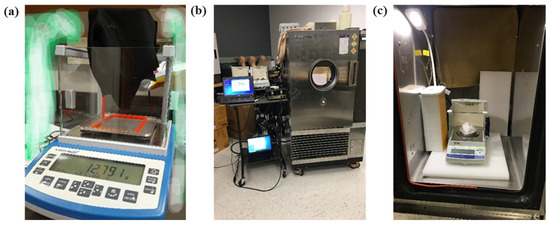Dynamic regain rate test experimental setup. (a) The digital scale consists of a glass door closed from four sides which will avoid variation in results due to airflow from sides. (b) Environmental chamber set up for 2-phase humidity change experiment. (c) Digital scale placed inside of the climate chamber.