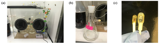 ISO 16533 setup for measuring the exothermic effect in the fabric. (a) A glove box of dimensions 45 cm × 45 cm × 40 cm placed into a fume hood. (b) Constant humidity container with temperature–RH sensor. (c) Size comparison of two MSR sensors, temperature sensor (left), temperature and humidity sensor (right).