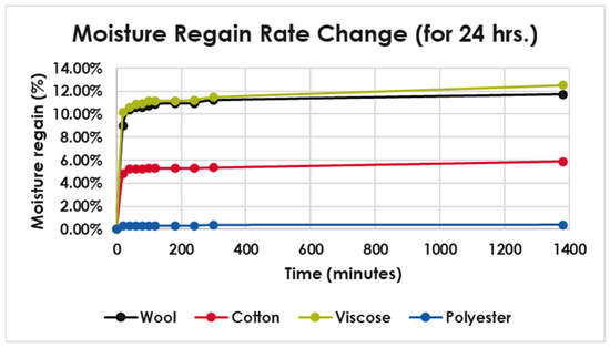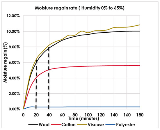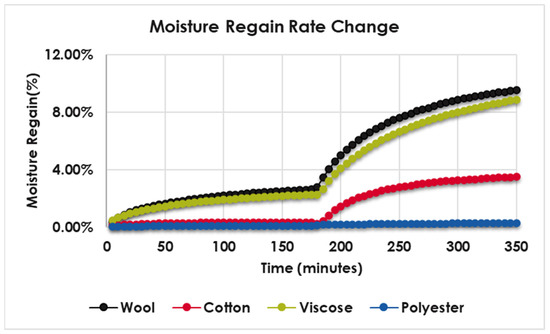 Figure 3 shows the moisture regain graph (%) versus time (minutes) for all fabric samples. All fabrics exhibited a similar pattern curve, having two phases. In the first phase, from the start of the test to about 20–30 min, the moisture was absorbed at a high rate due to the high RH gradient in RH (0 to 65%). After this rapid initial phase, the fabrics continued to slowly absorb water vapor from the environment until the end of the experiment. As observed before, not all fabrics reached their expected regain value after 3 h, but the water vapor absorption rate in the wool and viscose samples was greater than in the cotton samples. At 30 min after the first start of the rapid uptake phases, the values for wool, viscose, cotton, and polyester were 7.0%, 7.4%, 4.7%, and 0.3%, respectively; these values are approximately 50% of their expected moisture regain percentage.